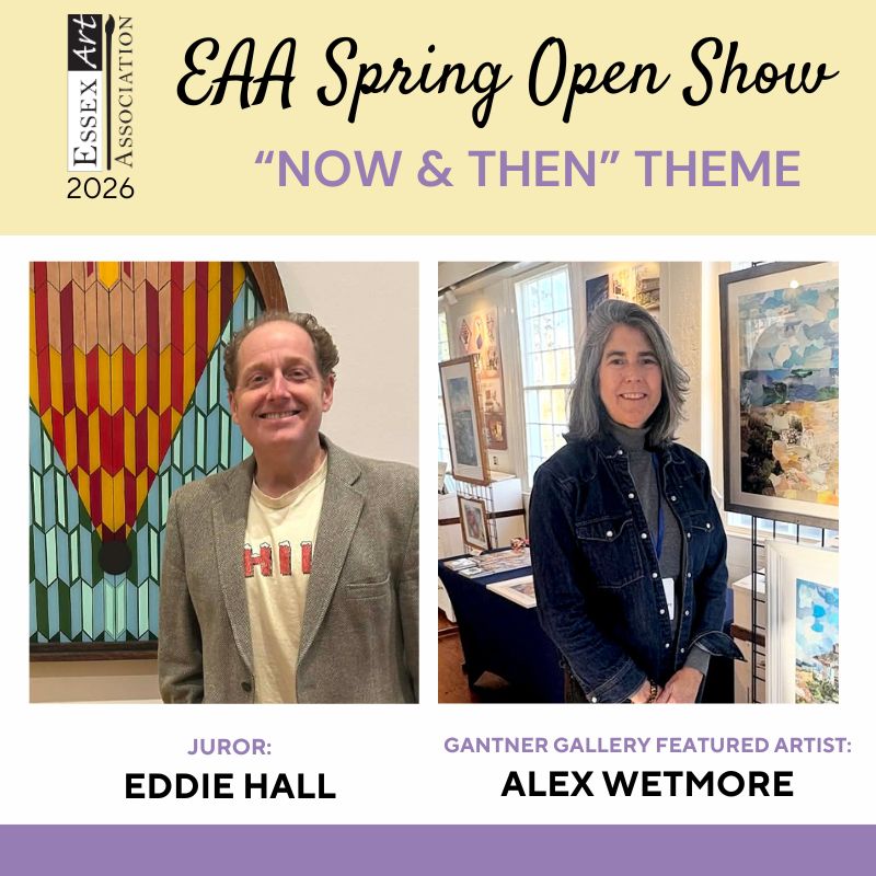 Please join us at 6 pm on Friday, April 24th, for the EAA Spring Open Show juried by Eddie Hall, along with Alex Wetmore's solo show in the Gantner Gallery. Award presentation at 7 pm. We are located on 10 North Main Street in Essex, CT. Gallery hours are Wednesdays thru Sundays from 1 to 5 pm starting April 17th. Admission is free!