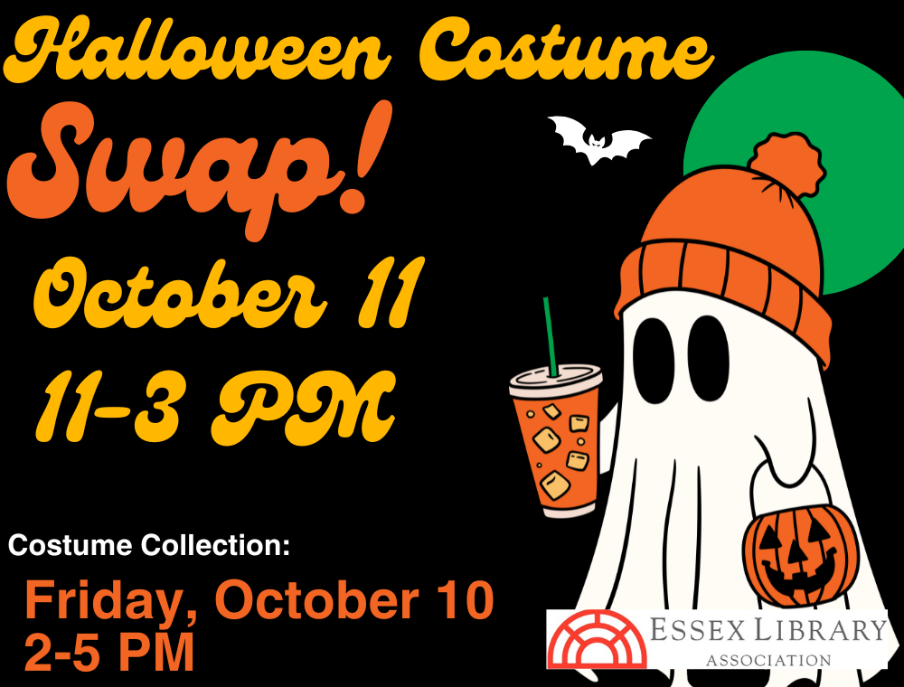 Program for families with kids of all ages. Come find something new-to-you for Halloween! Available costume sizes may range depending on the donations received. Costume accessories may be offered as well. You do not have to donate to choose a costume. Essex Library programs are free and open to the public. Costume donations will be collected on October 10 from 2-5 PM. Gently used or new costumes can be dropped off to the Children's department! No registration is required, drop in!