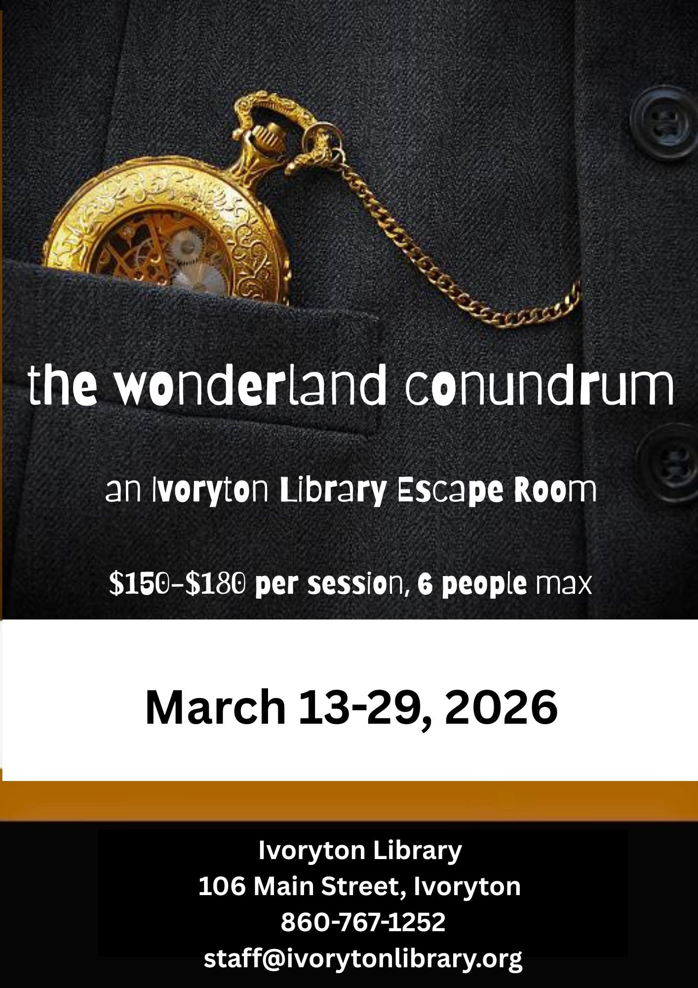 Ivoryton Library 106 Main Street, Ivoryton, United StatesThe "Wonderland Conundrum" Escape Room, running Friday, March 13th through Sunday, March 29th, invites teams to tumble down the Rabbit Hole for a whimsical event. The challenge is clear but daunting: teams must work together to capture the elusive White Rabbit and escape the Rabbit Hole before time runs out. The stakes are high, as failing to solve the puzzles in time risks the wrath of the Queen of Hearts and her infamous decree, "Off with their heads!" Designed for groups of friends, families, or colleagues, the experience accommodates teams of three to six people. Each group has exactly one hour to decipher clues, solve intricate puzzles, and unlock the secrets necessary to make their escape. It is an opportunity for participants to test their wits, teamwork, and problem-solving skills and have fun! Space is limited for this special two-week engagement, so early reservations are highly recommended. Secure your spot and view available time slots by visiting Ivoryton Library's Eventbrite page. The cost per team is $180, with a special weekday discount available for sessions on Monday through Thursday at 2:00 PM or 4:00 PM. Don’t miss your chance to take on the Queen of Hearts—reserve your escape today!