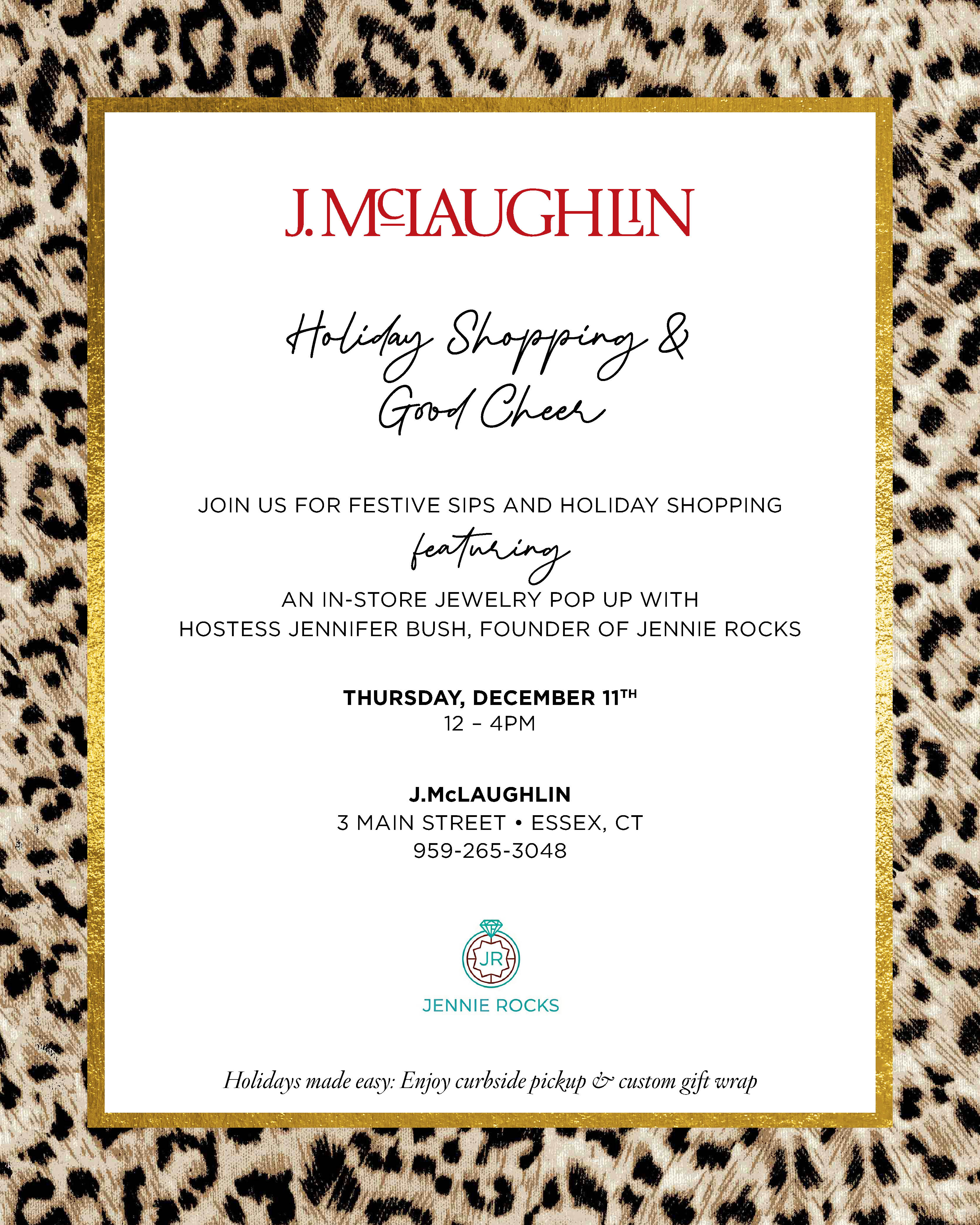 J. McLaugnlin 3 Main Street, Essex, CT, United StatesJoin us for Festive Sips & Holiday Shopping featuring an in-store jewelry pop up with Hostess Jennifer Bush, Founder of Jennie Rocks.